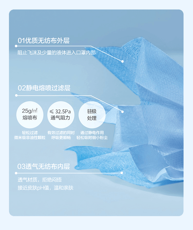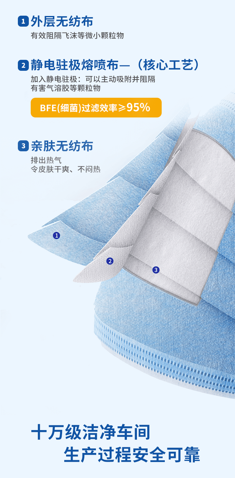 >優良無紡布外層,阻止飛沫及少量的液體進入口罩內部。