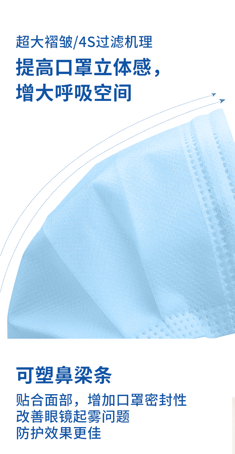>超大褶皺4S過濾機理,提高口罩立體感,加大呼吸空間。